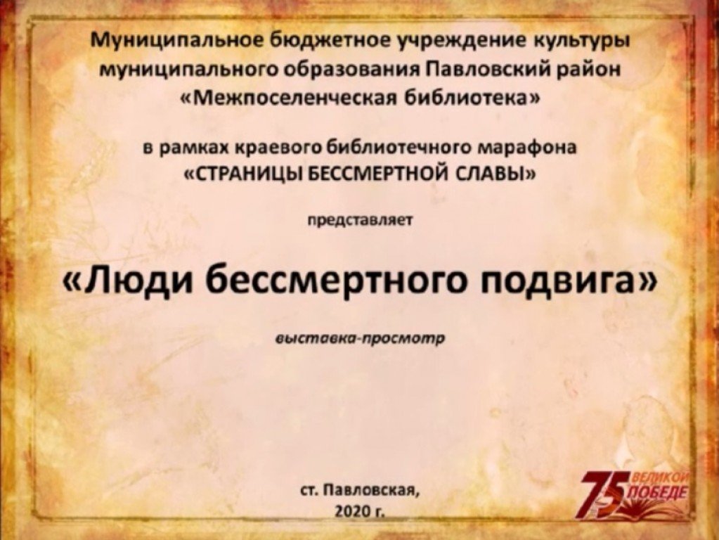 В рамках краевого библиотечного марафона "Страницы бессмертной славы" мы подготовили выставку-просмотр "Люди бессмертного подвига".