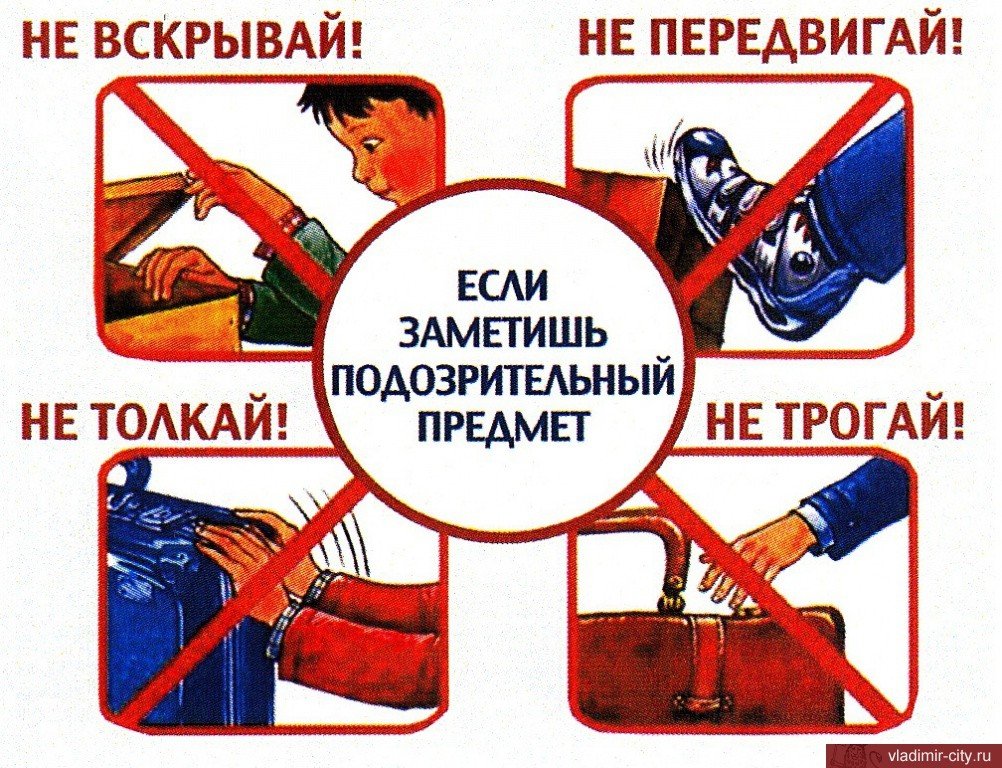 При обнаружении забытых вещей, не трогая их, сообщите об этом водителю, сотрудникам объекта, службы безопасности, органов милиции. Не пытайтесь заглянуть внутрь подозрительного пакета, коробки, иного предмета.